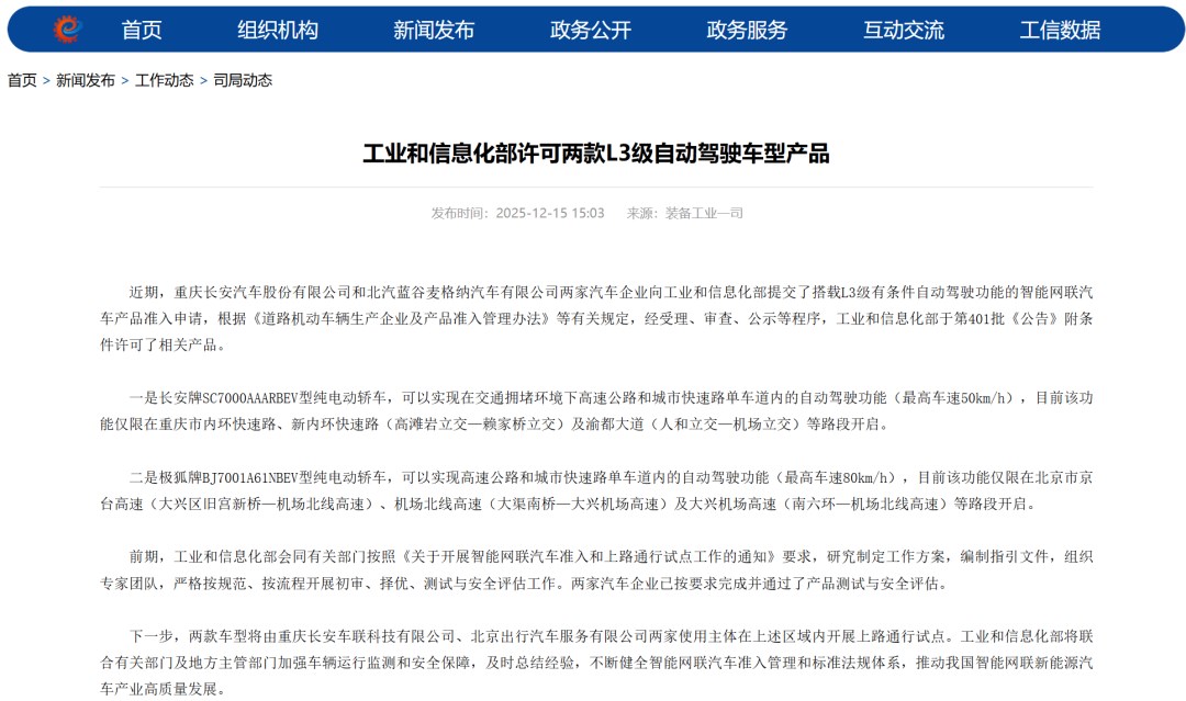 12月15日,工業(yè)和信息化部正式公布我國首批L3級有條件自動駕駛車型準入許可,重慶長安汽車股份有限公司和北汽藍谷麥格納汽車有限公司的兩款車型成為國內(nèi)首批獲準進行L3測試的量產(chǎn)車型。