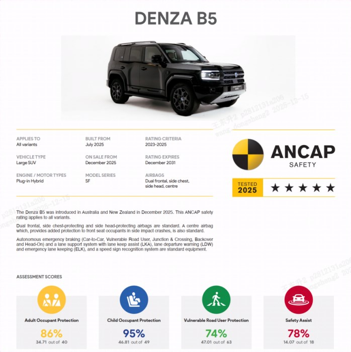 據悉,該測試結果是全球領先的汽車安全評估機構——澳洲新車安全評鑒協會(ANCAP)正式公布的車型安全評級,方程豹豹5憑借卓越的主動和被動安全性能,榮獲五星安全評級。在成人保護、兒童保護、行人保護、安全輔助等四大核心板塊測試項目均達到全球領先水平,其中兒童保護得分率為95%,是ANCAP歷年測試結果中排名最高的車型之一。